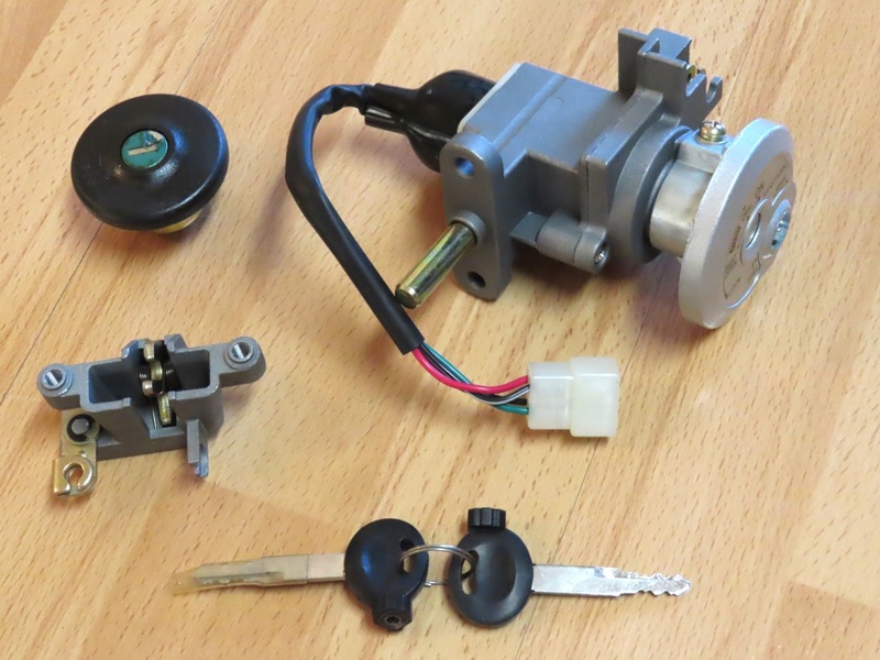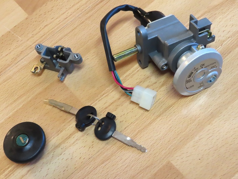 Sisältää virtalukon, kaksi avainta sekä istuimen lukon sekä korkin.